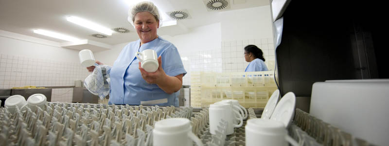 Pünktlich um 7 Uhr morgens fährt die große Spülmaschine an. Vorab füllen flinke Hände das breite Band, das langsam in die Bandspülmaschine gezogen wird. Sauberkeit ist auch in der Spülabteilung der Lukra:Service GmbH oberstes Gebot. Und so wird nach Durchlaufen der Spülmaschine im XXL-Format noch einmal per Hand kontrolliert, ob auch wirklich alles so gründlich sauber wie gewünscht wurde.
